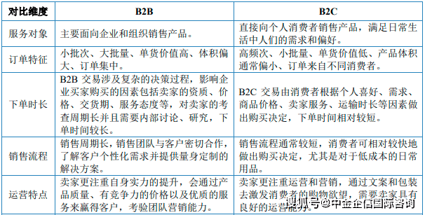 2)行业次要模式:目前,我国跨境电商贸易模式次要涉及B2B及B2C两种模式,C2C跨境电商买卖规模小,对跨境电商总体规模影响不大。取B2B模式比拟,B2C跨境电商正在办事对象、订单特征、发卖流程等方面存正在必然的差别,具体对比环境如下?。