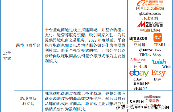 A。跨境电商平台:跨境电商平台模式相对成熟。亚马逊凭仗先发劣势和规模劣势,成为中国B2C跨境电商卖家着沉开辟的电商平台。其凭仗优良的办事和高性价比产物吸引卖家入驻和消费者消费;同时通过开展会员营业、优化商品推送算法及完美物流运输系统等体例不竭为电商营业注入新动力。除以亚马逊为代表的老牌跨境电商平台外,正在成长过程中,行业内还出现了速卖通、Wish等后进跨境电商平台。跟着经济下滑和供应链严重等要素导致全球消吃力分歧程度的下降以及跨境电商平台卖家多渠道结构的需求,近年来,以TEMU、TikTokShop等为代表的新入局的中国跨境电商平台凭仗优良的产质量量、积极的市场营销和优良的客户办事,成功打入国外市场并快速拓展营业规模,不竭为B2C跨境出口电商行业注入成长动能。