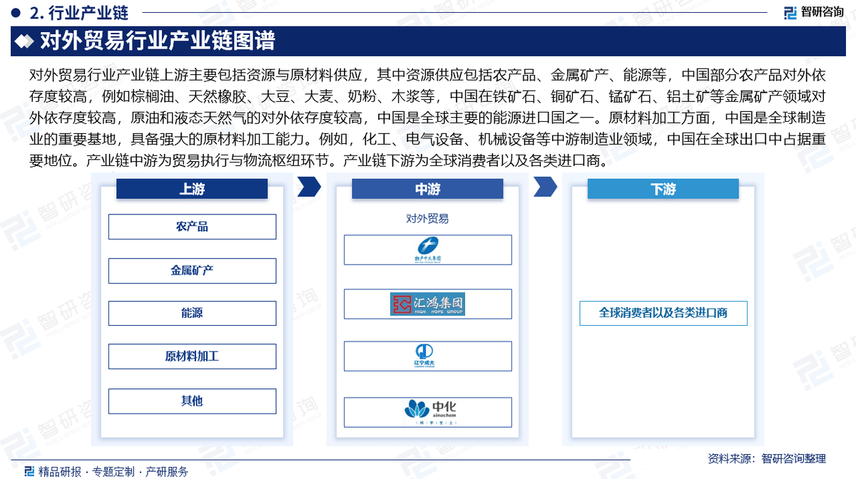 对外商业行业财产链上逛次要包罗资本取原材料供应,此中资本供应包罗农产物、金属矿产、能源等,中国部门农产物对外依存度较高,例如棕榈油、天然橡胶、大豆、奶粉、木浆等,中国正在铁矿石、铜矿石、锰矿石、铝土矿等金属矿产范畴对外依存度较高,中国是全球次要的能源进口国之一。原材料加工方面,中国是全球制制业的主要,具备强大的原材料加工能力。例如,化工、电气设备、机械设备等中逛制制业范畴,中国正在全球出口中占领主要地位。财产链中逛为商业施行取物流枢纽环节。财产链下逛为全球消费者以及各类进口商。