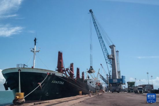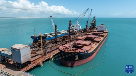 这是5月8日正在巴西塞阿拉州的佩森港拍摄的一艘正正在拆载矿产物的货轮(无人机照片)。记者 王天聪 摄。