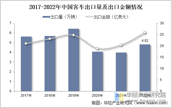本文节选自华经财产研究院发布的《2022年中国客车产销量及出口规模阐发,市场逐渐回暖,如需获取全文内容,可进入华经谍报网搜刮查看。我国客车次要以出口商业为从,出口规模弘远于进口规模。跟着近年来我国客车行业的不竭成长,我国客车出口规模也随之不竭扩张,2020年受疫情影响,全球客运蒙受严沉冲击,市场需求大幅下降,使得我国客车出口规模呈现大幅度下降。跟着疫情被无效节制,全球市场需求逐渐回升,出口规模起头逐渐回升。2022年我国客车出口量为4。82万辆,同比增加21。1%;出口金额为25。8亿美元,同比增加26。6%。