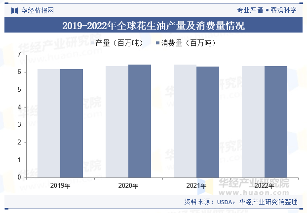 全球花生油行业供需根基均衡,按照美国农业部(USDA)数据,全球花生油产量从2019年的618万吨增加至2022年的637万吨,CAGR为0。96%。